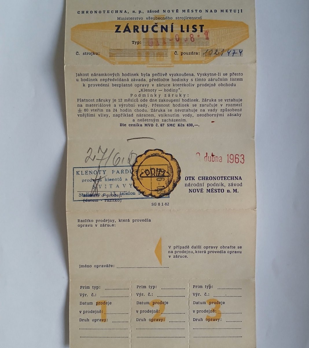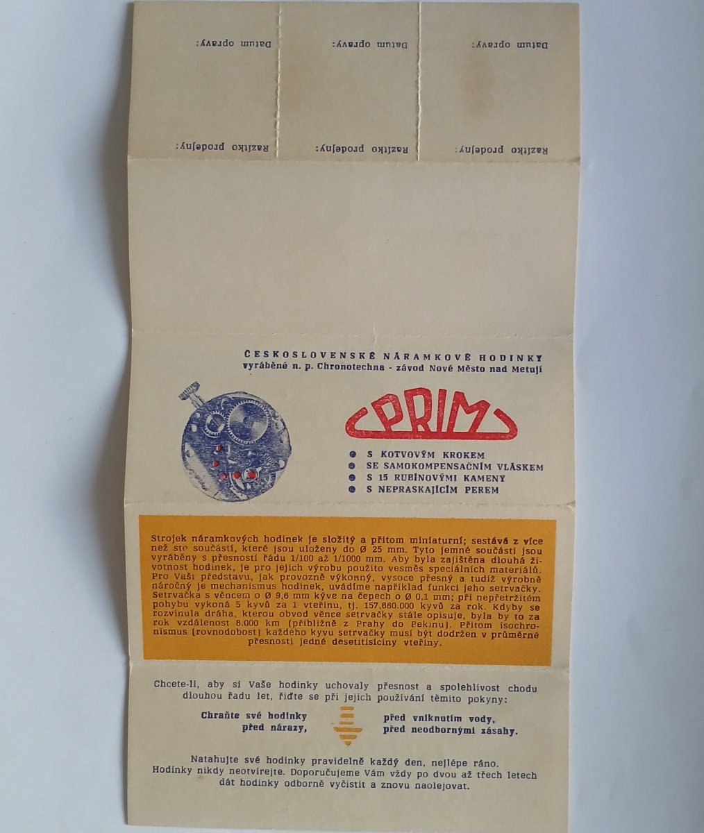Pěkně zachovalý záruční list k hodinkám PRIM