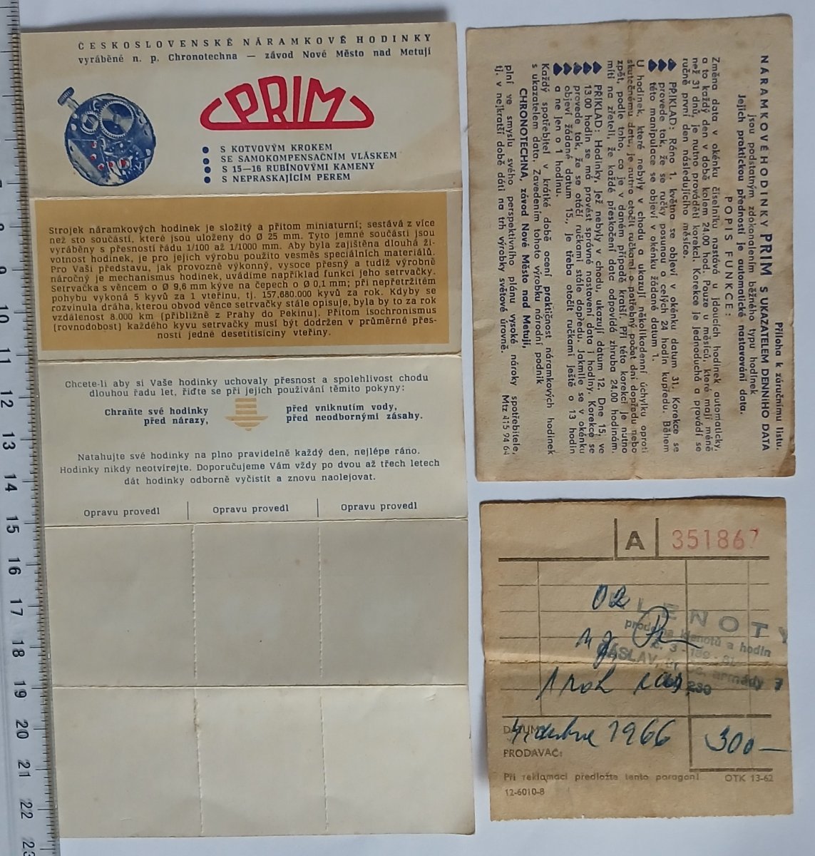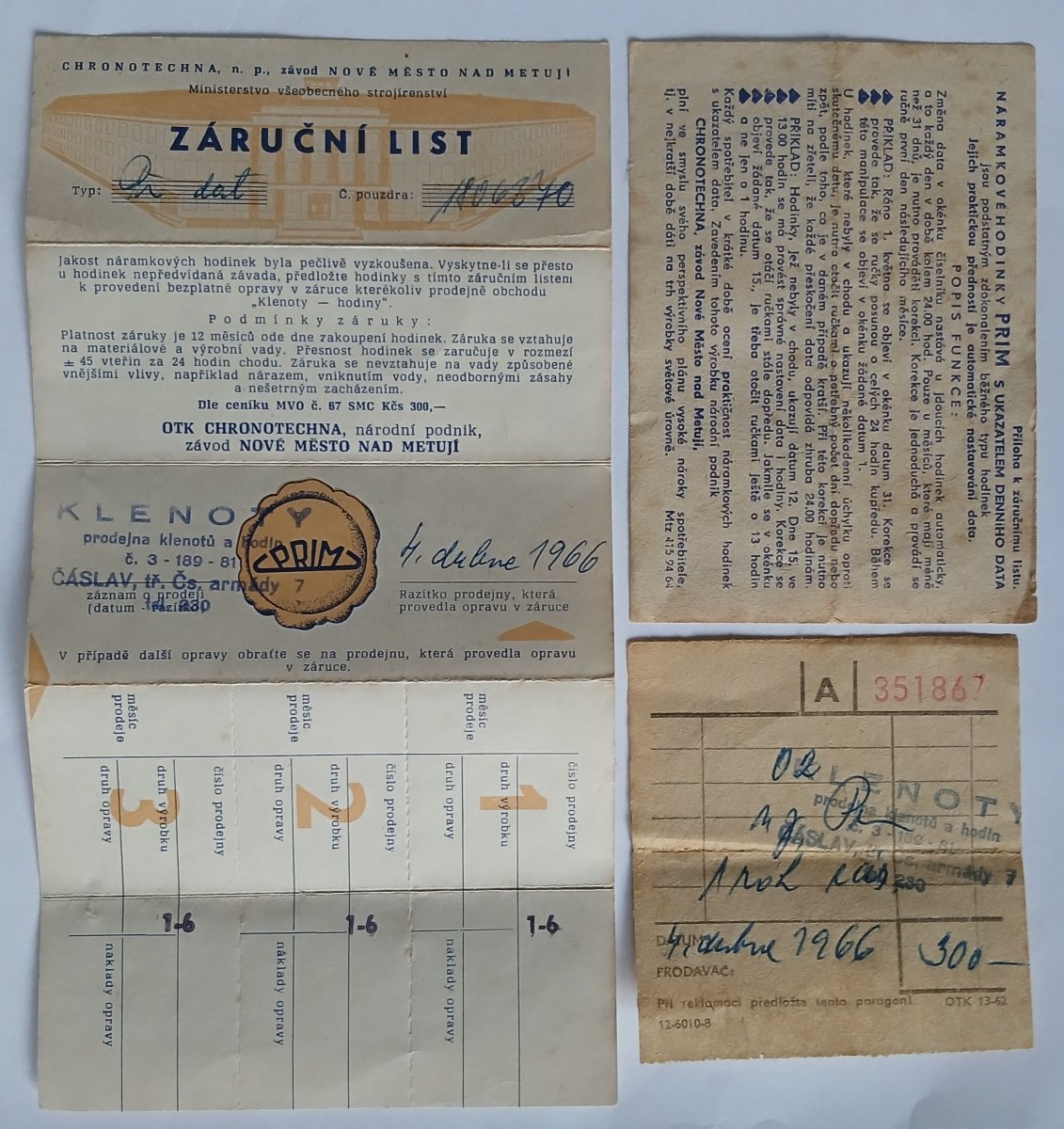 Záruční list na hodinky PRIM z 4. dubna 1966