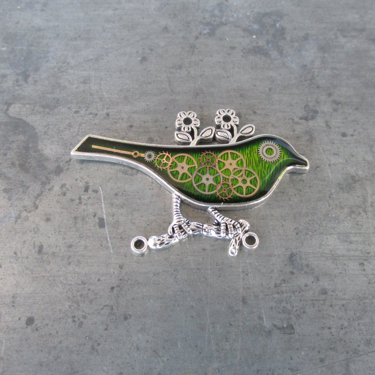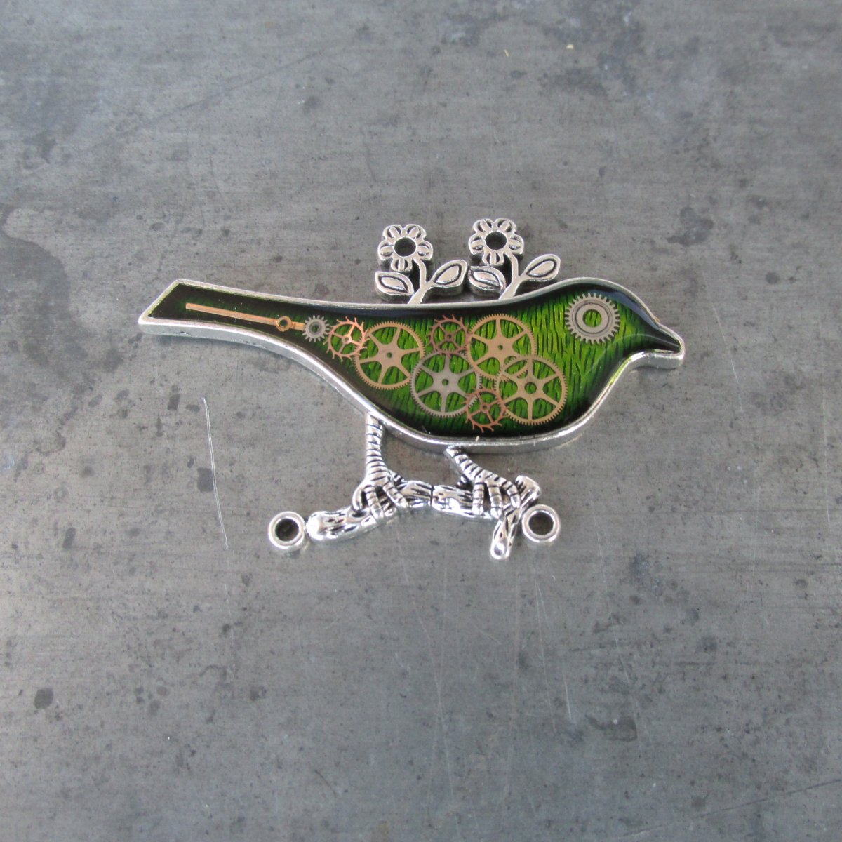 V OZDOBNÉM STŘÍBRNÉM PTÁČKU BAREVNĚ PODBARVENÉM JSOU ZALITY V LESKLÉ KŘIŠŤÁLOVÉ PRYSKYŘICI SOUČÁSTKY Z HODINEK PRIM, CELKOVÁ VELIKOST JE 4x6cm.